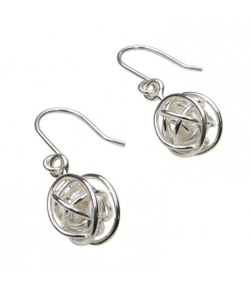 Knots of silver intricately woven into an open mesh ball drops from a shepherd hook.